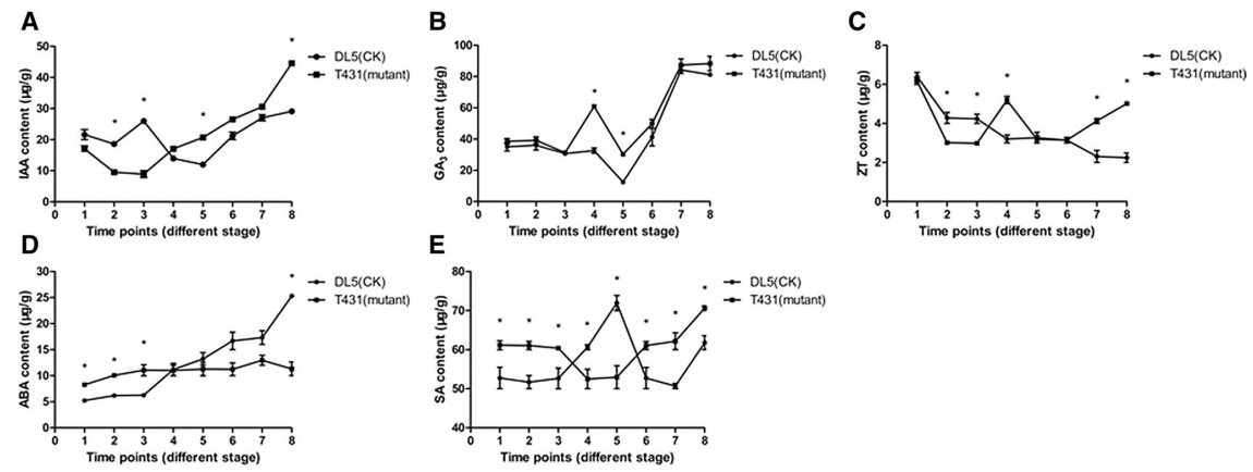 圖2 T431(不育材料)和DL5(對照材料)中不同激素在不同時(shí)期的變化趨勢