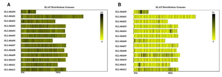 圖3 SLAF標簽分布圖(A)和多態(tài)性SLAF標簽分布圖(B)