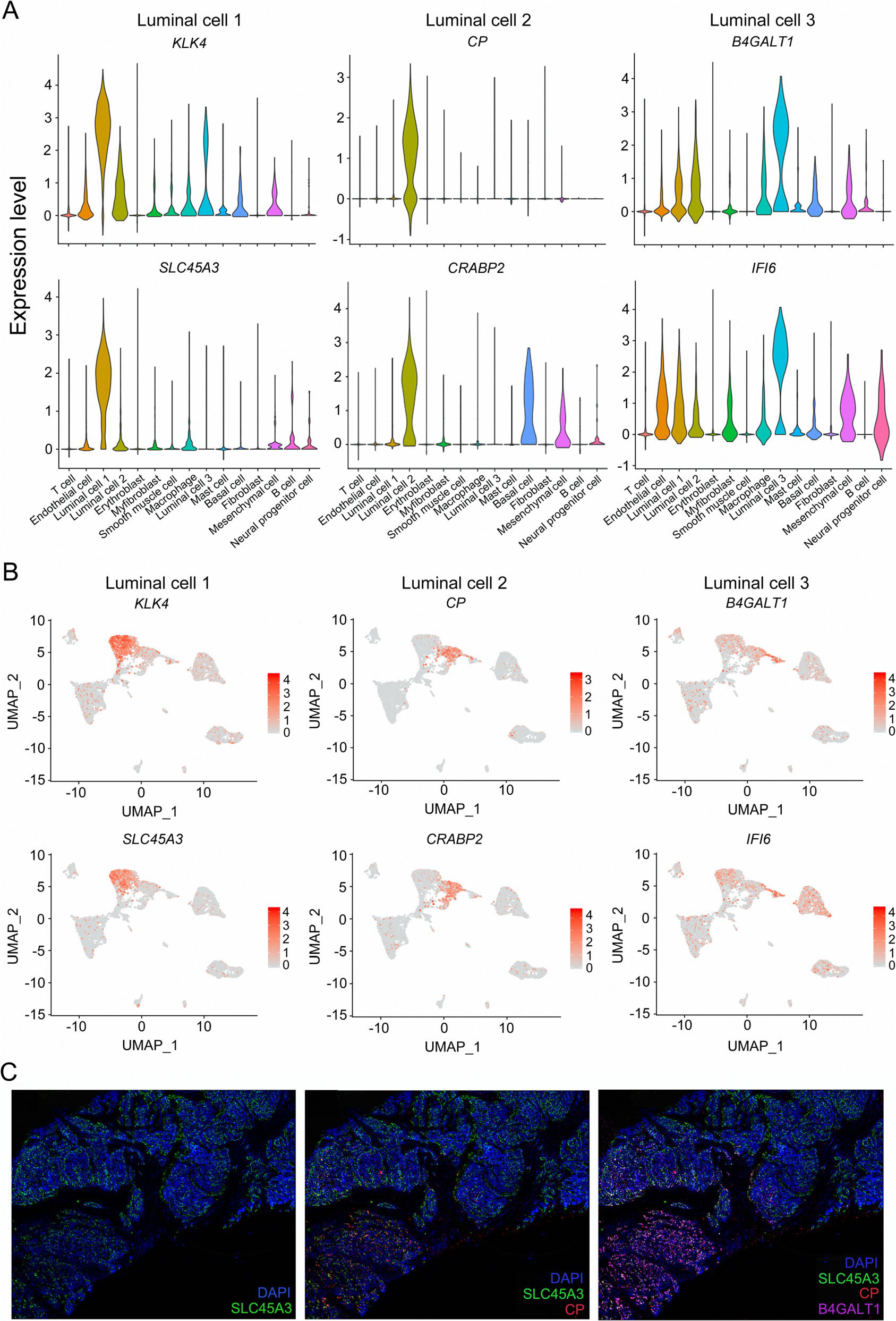 在本文的數據中,根據管腔標志物在PCa樣本中的高表達水平,確定了3種類(lèi)型的管腔細胞,包括角蛋白8(KRT8)和角蛋白18(KRT18)。為了表征這些管腔簇,作者用VlnPlot和FeaturePlot分別檢測了各自標記基因的表達模式。結果表明,這些溶解酶(k4a)可作為特異性的載體(k4a)表達于細胞內(k4a4)。銅藍蛋白(CP)在2型管腔細胞中唯一表達,而細胞維甲酸結合蛋白2(CRABP2)在間充質(zhì)細胞以及2型和3型管腔細胞中高表達,這表明CP更適合2型管腔細胞(圖2a,b)。與其他簇相比,3型管腔細胞表現出更高水平的β-1,4-半乳糖基轉移酶1(B4GALT1)和干擾素α誘導蛋白6(IFI6)的表達水平,表明B4GALT1和IFI6可以識別這些細胞(圖2a,b)。為了研究PCa組織中每種類(lèi)型管腔細胞的細胞學(xué)定位,我們使用抗SLC45A3、抗CP、抗B4GALT1抗體進(jìn)行免疫染色,并用DAPI復染組織切片(圖2c)。SLC45A3在前列腺組織的大多數管腔細胞中表達(圖2c)。相反,在一小部分管腔細胞中檢測到低表達水平的SLC45A3(圖2c)。不同類(lèi)型的癌細胞在T1區的發(fā)育不完全相同(圖2 c)。