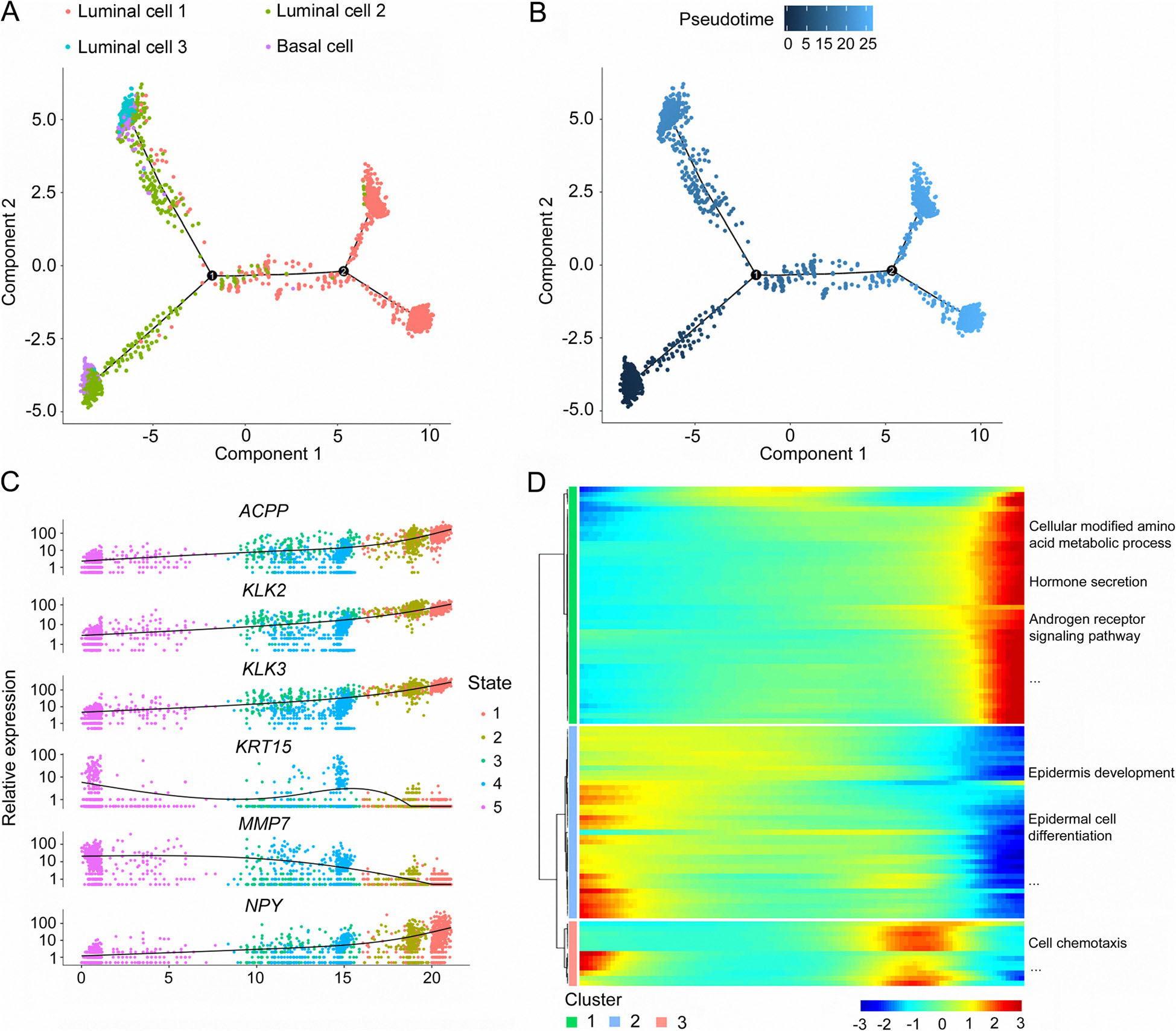 作者進(jìn)一步分析了基因沿軌跡的動(dòng)態(tài)表達變化,以確定PCa進(jìn)展的關(guān)鍵基因。表達變化最顯著(zhù)的基因包括:酸性磷酸酶、前列腺(ACPP)、激肽釋放酶相關(guān)肽酶2(KLK2)、KLK3、角蛋白15(KRT15)、基質(zhì)金屬肽酶7(MMP7)和NPY(圖4c)。此外,作者對前100個(gè)基因進(jìn)行了擬時(shí)間表達模式的聚類(lèi)分析,并分析了每個(gè)簇的功能豐富程度。聚類(lèi)1中的基因高度表達于終末期,主要富集于PCa起始和進(jìn)展相關(guān)的過(guò)程,包括細胞修飾的氨基酸代謝過(guò)程、激素分泌和AR信號通路(圖4d)。第二類(lèi)基因在前列腺發(fā)育初期表現出高表達水平,主要參與表皮發(fā)育和表皮細胞分化,提示其在前列腺正常發(fā)育中的潛在作用(圖4d)。聚類(lèi)3中的大多數基因在假時(shí)間軌跡的中間階段表達增加,并在細胞趨化性中富集(圖4d)。