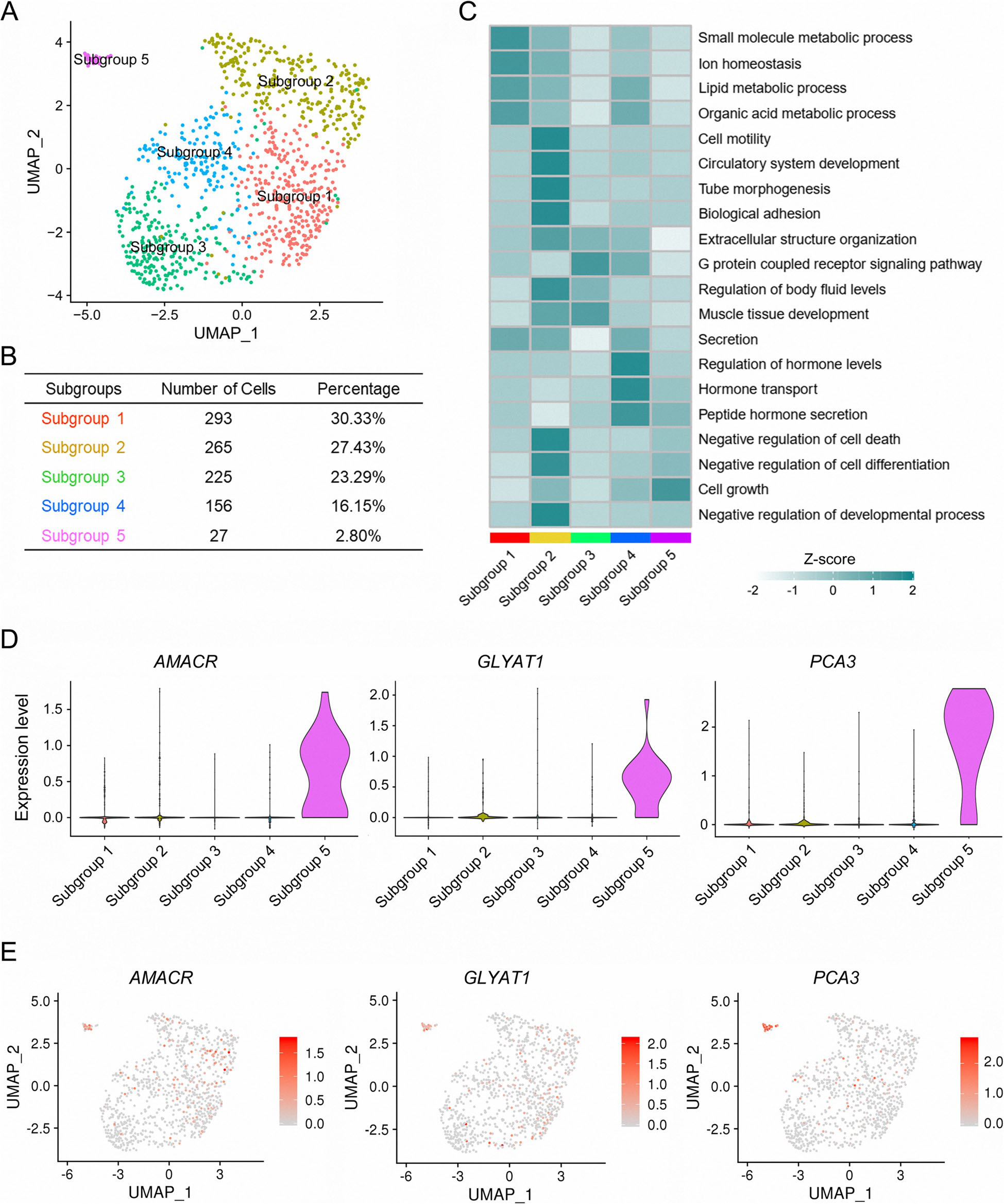 作者首先分析來(lái)自TCGA的公共PCa患者中每個(gè)管腔標志基因的表達水平,以檢驗它們與PCa發(fā)生和發(fā)展的臨床相關(guān)性。相比之下,大多數1型管腔標記基因在惡性程度較低的前列腺癌中的表達高于惡性程度高或正常前列腺,這表明在前列腺癌的發(fā)生和早期發(fā)展中有潛在的作用(補充圖5)。因此,作者對1型管腔細胞進(jìn)行了亞聚類(lèi),以確定引起PCa的亞群。PCA將1型管腔細胞分為5個(gè)亞組(圖5a,b)。分析每個(gè)亞組標記基因的功能富集,亞組1與腫瘤細胞有絲分裂準備所必需的生物分子代謝過(guò)程有關(guān),如脂質(zhì)代謝過(guò)程和有機酸代謝過(guò)程(圖5c)。與其他亞組相比,亞組2與細胞運動(dòng)、管形態(tài)發(fā)生和細胞死亡負調控有關(guān),這些過(guò)程對腫瘤的遷移和生長(cháng)至關(guān)重要(圖5c)。亞組3主要參與G蛋白偶聯(lián)受體信號通路和肌肉組織發(fā)育(圖5c)。第4亞組與PCa相關(guān)的過(guò)程,包括激素水平的調節,激素轉運和肽激素轉錄(圖5c)。相比之下,第5亞群的獨特功能主要集中在細胞生長(cháng)(圖5c)。VlnPlot和特征圖顯示,AMACR、甘氨酸鈉基轉移酶樣1(GLYATL1)和PCA3在5亞組中特異表達(圖5d,e)。有趣的是,AMACR是一種在前列腺癌中高度表達的過(guò)氧化物酶體酶,參與支鏈脂肪酸和膽汁酸中間產(chǎn)物的β-氧化,對PCa的發(fā)生和發(fā)展至關(guān)重要。PCA3是一種非編碼RNA,在PCa細胞系、原發(fā)組織甚至PCa患者尿液中高表達。這兩個(gè)5亞組的標記物已經(jīng)被用于PCa的診斷和分層,這意味著(zhù)5亞組可能是臨床上PCa診斷和分層所必需的一組不同的細胞。
