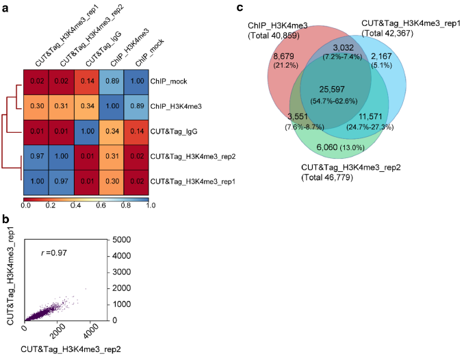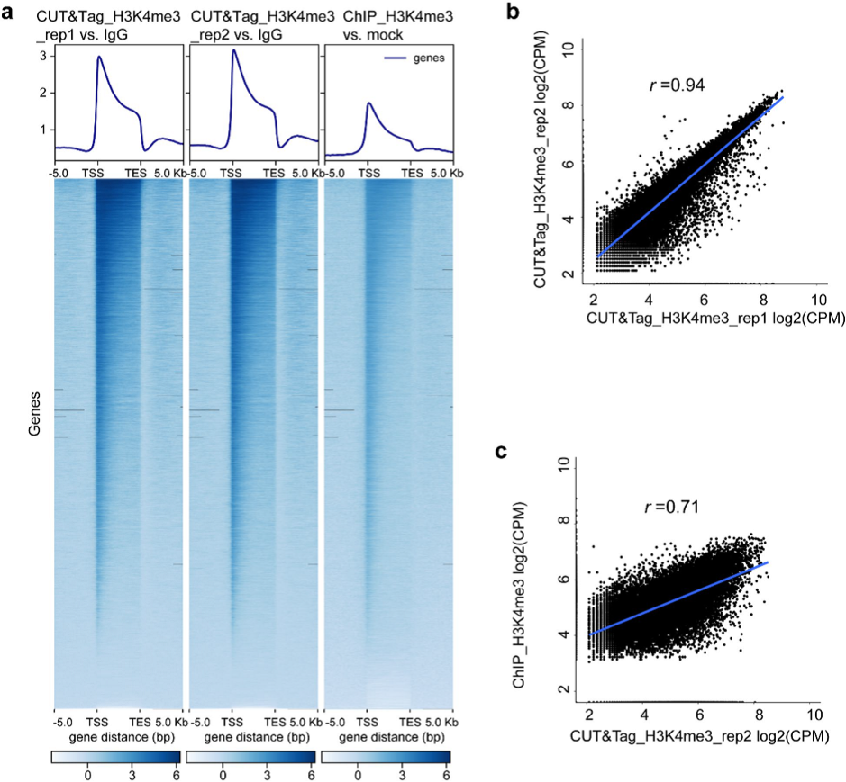 FRiP(fraction of reads in peaks)values calculated the ratio of mapped reads that fall into peaks among all mapped reads. FRiP值越高,信噪比越高,結果也越可靠。結果表明CUT&Tag產(chǎn)生的信噪比較高(FRiP=0.7;表1)。然而,從H3K4me3信號熱圖上可以看出,在整個(gè)gene body區域CUT&Tag的信號比ChIP-Seq更強(圖4,a)。從相關(guān)性分析的結果可以看出,基因附近的peaks在CUT&Tag兩個(gè)生物學(xué)重復之間相關(guān)性很高(r=0.94,pearson’s correlation;圖4,b),CUT&Tag和ChIP之間的相關(guān)性也較高(r=0.71,pearson’s correlation;圖4,c)。