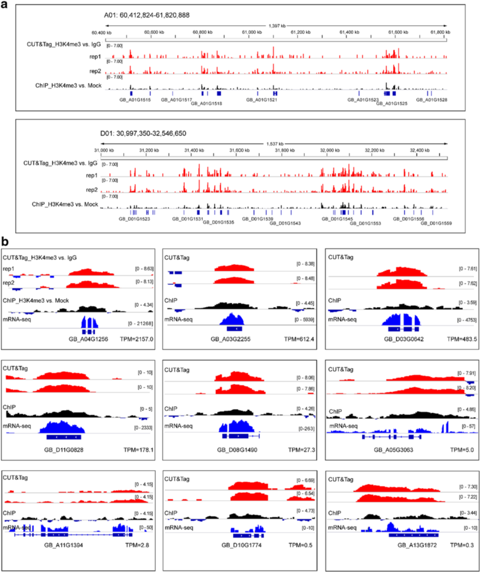 與熱圖顯示的強度一致,IGV截圖表明CUT&Tag信號在分辨率和靈敏度上的表現優(yōu)于ChIP(圖5,a),尤其在表達量相對低的基因中表現尤為明顯(如GB_A11G1394, GB_D10G1774, 和 GB_A13G1872;圖5,b)