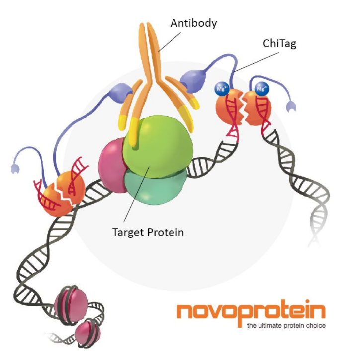 CUT&Tag使用Protein A與Tn5轉座酶的融合蛋白(ChiTag),在抗體的引導下,Protein A與染色質(zhì)上的目的組蛋白修飾標記、轉錄因子或染色質(zhì)調控蛋白結合,連帶的Tn5轉座酶對目的蛋白附近的DNA序列進(jìn)行切割,并將測序接頭連接到切割片段的兩端(圖1),并釋放到細胞外,PCR擴增后直接用于高通量測序。