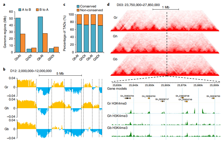 與祖先材料做研究比較更是多倍體中亙古不變的話(huà)題。物種在由祖先進(jìn)化、加倍而成現代多倍體材料的過(guò)程中,三維結構發(fā)生如何的變化,是否引起相關(guān)功能的差異?例如相比于二倍體亞洲棉陸地棉和海島棉的A/B compartment比較分析,發(fā)現存在大量A到B的轉換,以及一定區域出現了B到A的轉換。同時(shí)相對于祖先基因組,亞基因組發(fā)生了不同程度的Compartment的轉換,At亞基因組轉換明顯高于Dt。