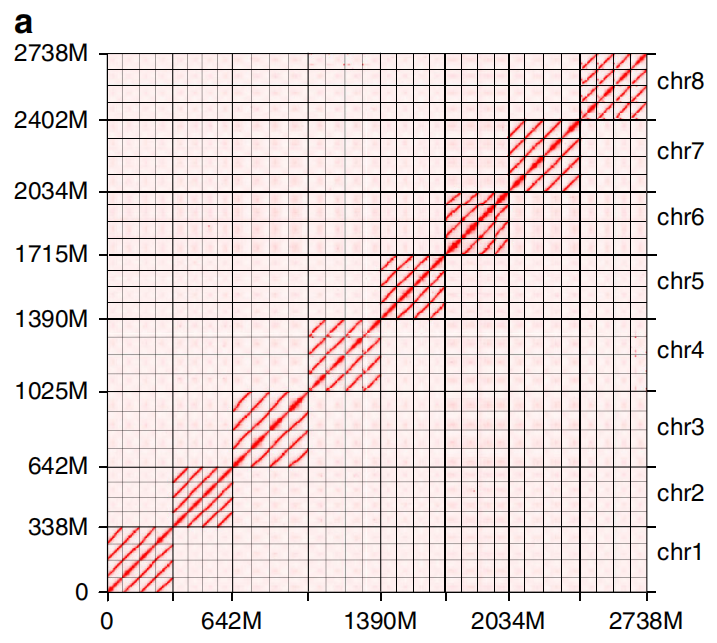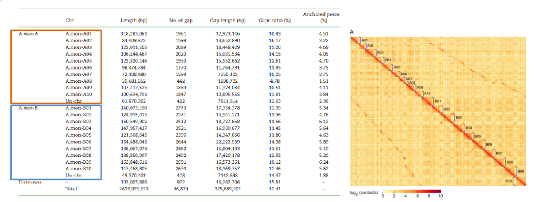 圖2 祖先種序列比對以及分亞基因組的Hi-C熱圖