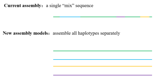 同源多倍體是指所有染色體組來(lái)源于一個(gè)個(gè)體的染色體組自我復制或同一個(gè)物種內不同個(gè)體間的雜交與多倍化。通常二倍體基因組裝出單套基因組,異源四倍體能組裝出兩套基因組。而由于早期的技術(shù)限制,同源多倍體物種往往只能組裝1-2套(例如2017年甘薯基因組)。隨著(zhù)技術(shù)的發(fā)展以及研究的深入,研究者發(fā)現僅單套的基因組數據難以完全演示該物種的全面信息。尤其是一些同源多倍體的物種,同源染色體之間不同遺傳位點(diǎn)的組合對生物表型有重要影響,如動(dòng)植物中的雜種優(yōu)勢、某些物種雜交不育現象等。單倍型等位基因間差異對基因表達、功能及其表型都有著(zhù)重要影響,大多數雜交品種的優(yōu)勢表型都受等位基因調控。