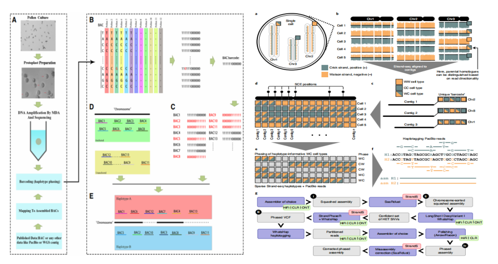 Bar-coding:將花粉單細胞結合構建的人工染色體(BAC,artificialchromosome)進(jìn)行單倍型分型。Strand-seq:短reads結合單細胞通過(guò)胸苷類(lèi)似物選擇性標記去除一條DNA鏈,并可與長(cháng)reads測序數據結合使用來(lái)完成單倍型分型。