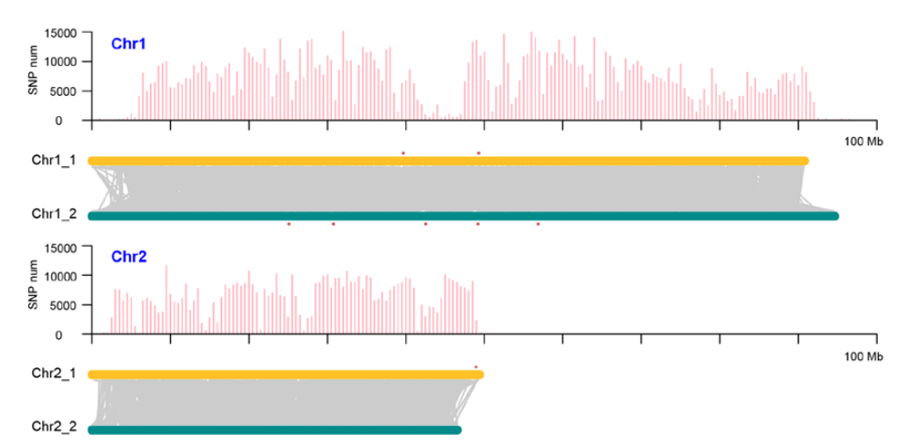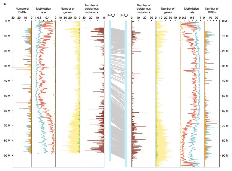 隨著(zhù)單倍型的解析,不少研究發(fā)現在同源染色體間有大量的變異信息,而這些突變累積很可能引起等位基因的有害/有益替代。從而可以對亞基因組(同源染色體)間基因含量、GC含量、基因結構、重復元件分布等比較、亞基因組間結構變異(倒置、易位),結合TE分布等進(jìn)行亞基因組(同源染色體)間差異分析。