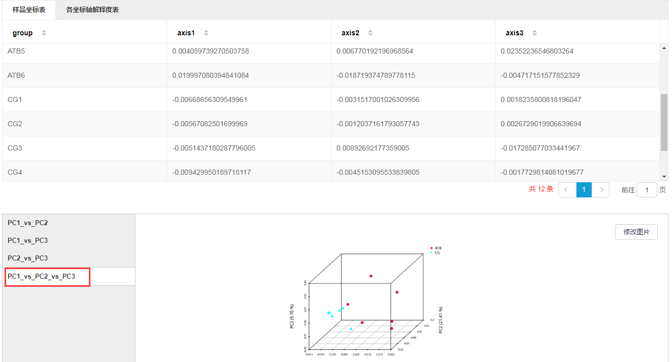 PCA/PCoA分析通常使用第一軸和第二軸的信息展示樣品或者分組之間的聚集和差異,當第一軸和第二軸不足以展示組間差異時(shí),我們可以通過(guò)三維圖查看前3軸對樣品間差異的影響。打開(kāi)結題報告后點(diǎn)擊“Beat多樣性分析”中的PCA分析或者PCoA分析,選中樣品或者分組,提交任務(wù)后會(huì )顯示三維分析結果。