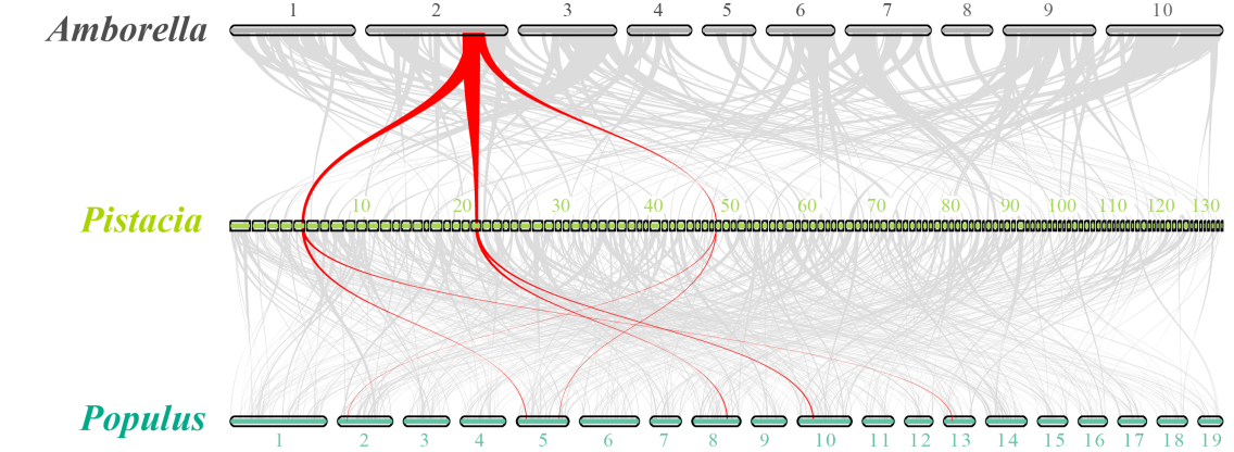 如2019年百邁客合作發(fā)表于《Genome Biology》開(kāi)心果基因組文章事例所示:每個(gè)無(wú)油樟區域對應三個(gè)開(kāi)心果區域,每個(gè)開(kāi)心果區域對應有兩個(gè)毛果楊區域,暗示了開(kāi)心果在毛果楊之外又發(fā)生了一次獨立的復制事件。
