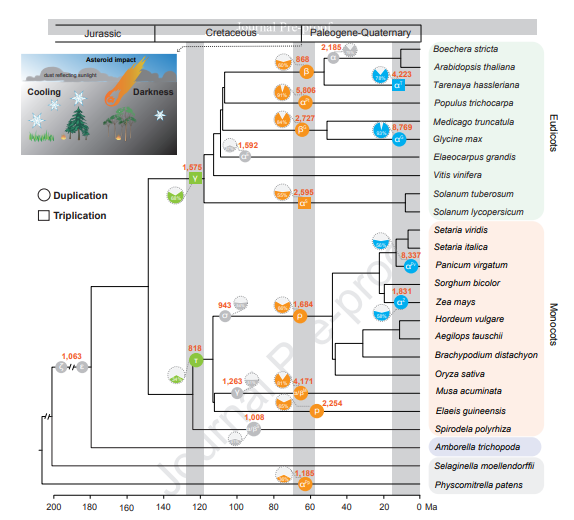 多倍化(polyploidy)或全基因組加倍(whole genome duplication, WGD)事件使基因組內的所有基因都發(fā)生重復,為生物進(jìn)化提供了原始的遺傳材料,被認為是進(jìn)化的加速器。全基因組復制事件在真菌或動(dòng)植物中都有發(fā)生,是基因組中基因數量變化、基因新功能的形成、基因重排等的重要推動(dòng)力。