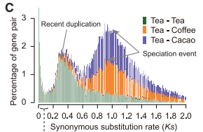 KS:全基因組加倍事件會(huì )產(chǎn)生大量的同源基因,反映在Ks值上便是會(huì )有大量的Ks值接近的同源基因對的產(chǎn)生,Ks值峰就對應了全基因組加倍事件的存在。