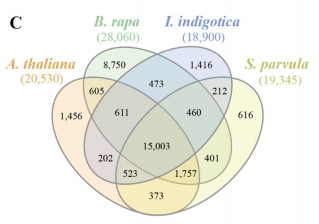 基因家族(gene family),是來(lái)源于同一個(gè)祖先,由一個(gè)基因通過(guò)基因重復而產(chǎn)生兩個(gè)或更多的拷貝而構成的一組基因,它們在結構和功能上具有明顯的相似性,編碼相似的蛋白質(zhì)產(chǎn)物。對物種的蛋白序列進(jìn)行家族分類(lèi),對獲得基因家族進(jìn)行注釋?zhuān)粚Ρ疚锓N的特有基因家族進(jìn)行GO和KEGG富集分析。物種共有基因家族中的單拷貝同源基因數目,用于系統發(fā)育樹(shù)的構建等分析。Veen圖中非重疊區與重疊區的數量分別表示幾個(gè)物種間特有基因家族和共有基因家族的數量。