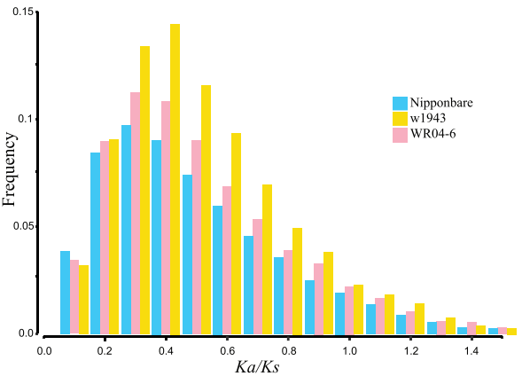 選擇壓力是指外界施加給某物種生物進(jìn)化過(guò)程中的壓力,使得物種適應自然環(huán)境。在遺傳學(xué)中,Ka/Ks或者dN/dS表示的是異意替換(Ka)和同意替換(Ks)之間的比例。一般認為,同義突變不受自然選擇,而非同義突變則受到自然選擇作用。如果Ka/Ks>1,則認為有正選擇效應。如果Ka /Ks=1,則認為存在中性選擇。如果Ka/Ks<1,則認為有純化選擇作用。如2019年百邁客合作發(fā)表于《Molecular Plant》文章雜草稻基因家族聚類(lèi)圖例所示:ka/ks值在1.4到1.5之間,雜草稻(WR04-6)比野生稻(w1943)含有更多的基因;明雜草稻基因組中的基因可能積累了比栽培稻更多的功能突變,這意味著(zhù)雜草稻的半馴化導致了雜草的進(jìn)化。