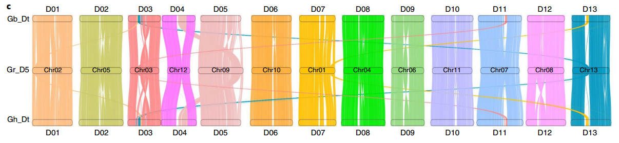 如2018年百邁客合作發(fā)表于《Nature Genetics》陸地棉與海島棉基因組文章圖例所示:海島棉染色體D05和陸地棉D12中均存在大的染色體臂間倒位,暗示這些變異出現在多倍化之后;兩個(gè)四倍體相對于G. raimondii共有一些結構變異,例如染色體D09中兩個(gè)四倍體發(fā)生了大的反轉。?
