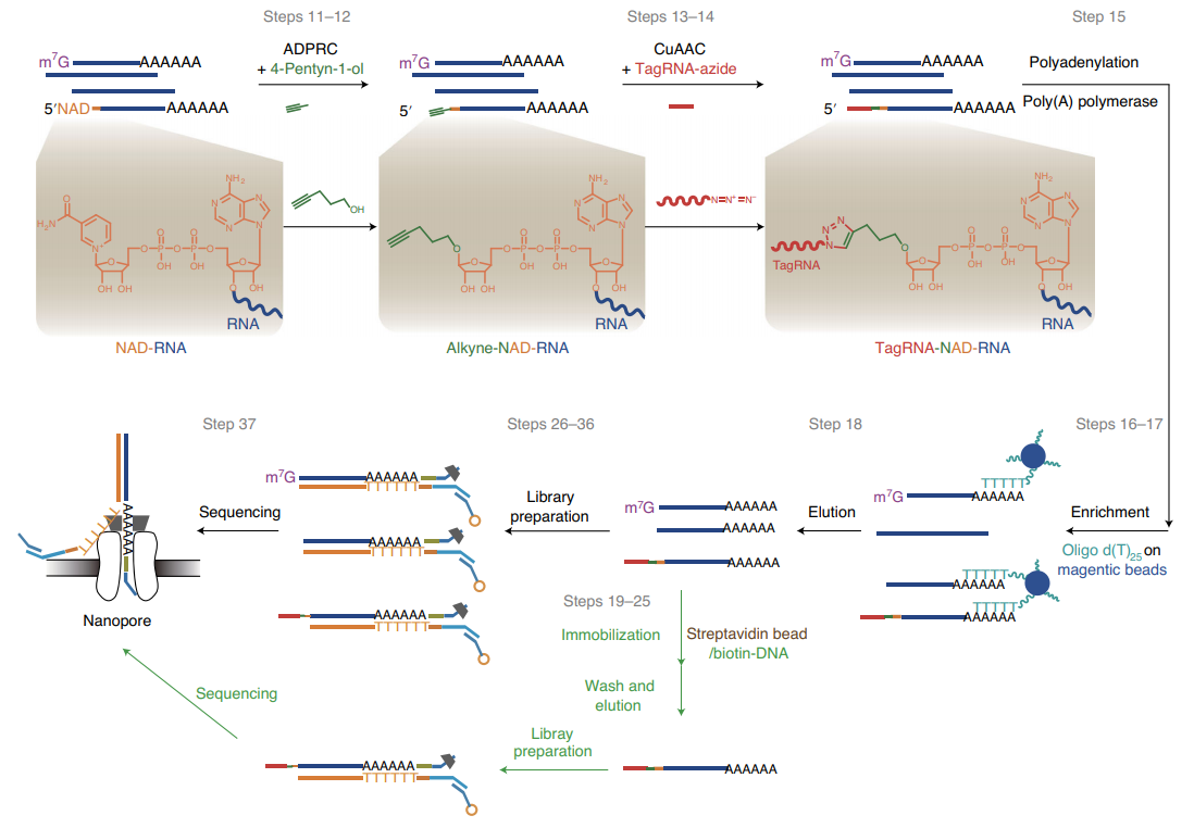 幾年前,開(kāi)發(fā)了NAD captureSeq,用于NAD-RNA的轉錄組范圍分析。在NAD captureSeq中,腺苷二磷酸核糖基環(huán)化酶(ADPRC)用于將NAD +的煙酰胺部分替換為含炔烴的分子,稱(chēng)為4-戊炔-1-醇。然后通過(guò)點(diǎn)擊化學(xué)反應(銅催化的疊氮炔炔環(huán)加成(CuAAC))將炔基化產(chǎn)物與生物素疊氮化物連接。用鏈霉親和素樹(shù)脂富集生物素標記的RNA,然后制備通過(guò)二代測序技術(shù)(NGS)測序的cDNA文庫。陰性對照RNA樣品的處理方法相同,但不使用ADPRC。如果與陰性對照相比,在A(yíng)DPRC處理的樣品中富集了特定的RNA,則其某些轉錄本被認為是NAD +?capped。通過(guò)NAD captureSeq,已在細菌,酵母,植物和人類(lèi)細胞中鑒定出NAD-RNA。缺點(diǎn):非生物素化的RNA與鏈霉親和素樹(shù)脂的非特異性結合。由于NAD-RNA水平很低,因此非特異性結合可能會(huì )顯著(zhù)降低敏感性并引入誤差。在生物素標記過(guò)程中RNA的斷裂以及隨后cDNA文庫的構建導致NAD-RNA總體序列結構信息的丟失。