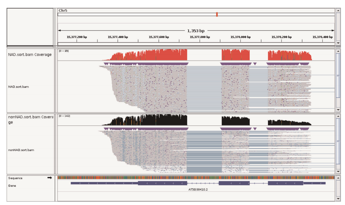 從TagSeek步驟生成的帶標簽和不帶標簽的reads可以接受TagSeqQuant,它使用Minimap2的默認比對參數。在TagSeqQuant中,還通過(guò)FastQC對reads進(jìn)行質(zhì)量檢查,并生成一個(gè)html文件以顯示測序質(zhì)量。經(jīng)過(guò)上述分析步驟后,將生成NAD-RNA和非NAD-RNA的基因覆蓋文件,以進(jìn)行IGV可視化(圖3),并生成基因和isoforms的計數表以進(jìn)行進(jìn)一步分析。