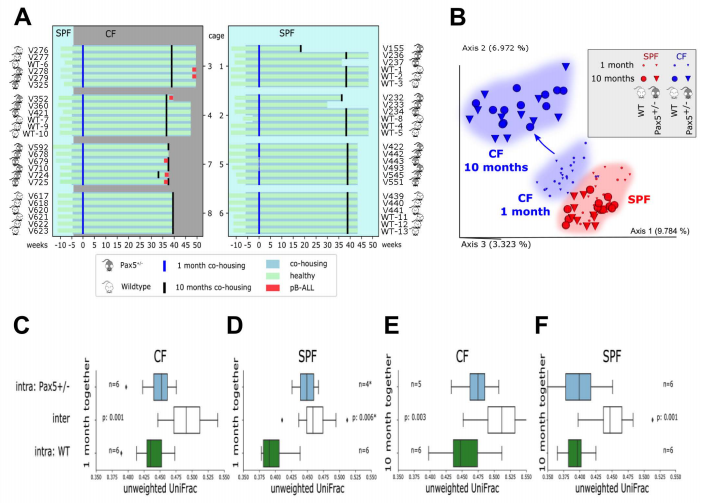 為了研究腸道微生物群在Pax5+/-小鼠PB-ALL發(fā)育中的作用,我們建立了一個(gè)由24只對照仔鼠野生型(WT)和24只Pax5+/-雌性小鼠組成的小鼠隊列。每籠飼養6只小鼠,分別飼養在混合基因型籠子(每個(gè)基因型3只,籠子1-4)或相同基因型籠子(同一基因型6只小鼠,籠子5-8)中(圖1A)。