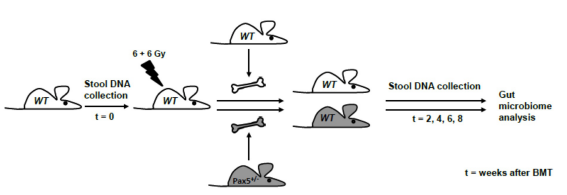 五、在沒(méi)有感染性刺激的情況下,通過(guò)細菌枯竭改變腸道微生物群落可以促進(jìn)遺傳易感性Pax5+/-小鼠的PB-ALL發(fā)育