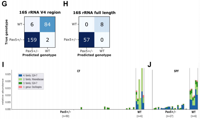 我們通過(guò)獨立地將機器學(xué)習方法應用于3983個(gè)ASV,進(jìn)一步將基因型分離ASV的集合細化到只有40個(gè)。ASV根據特征重要性進(jìn)行排序,由“隨機森林”算法確定,41個(gè)ASV用50%的樣本進(jìn)行訓練,并在剩余50%的樣本上進(jìn)行測試。這40個(gè)ASV足以準確(96.8%)預測小鼠基因型(圖1G)。事實(shí)上,這種機器學(xué)習工具能夠預測小鼠的基因型,這證實(shí)了Pax5雜合性形成了特定的腸道微生物群落。值得注意的是,16S rRNA全長(cháng)測序使我們僅使用5212個(gè)全長(cháng)ASV中的4個(gè),就進(jìn)一步提高了Pax5+/-和WT動(dòng)物之間的基因型預測的準確性,準確率達到100%(圖1H)。WT和Pax5+/-小鼠微生物群的主要區別在于Pax5+/-小鼠缺乏完整的共生菌。具體地說(shuō),在WT小鼠中可以檢測到的Rikenellaceae、S24-7和Oscillospira屬的成員在CF的Pax5+/-小鼠的微生物群落中缺失(圖1I)。在SPF中,在Pax5+/-小鼠的微生物群落中沒(méi)有檢測到Rikenellaceae和Oscillospira屬的成員(圖1J)。