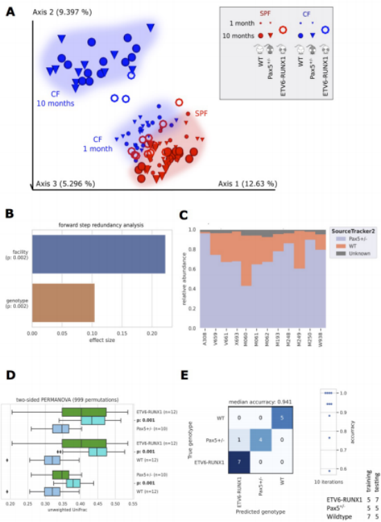 Sca1-ETV6-RUNX1小鼠在SPF組10個(gè)月時(shí)和CF組3~4個(gè)月時(shí)進(jìn)行微生物群分析。將這些數據與我們之前的分析相結合,證實(shí)了環(huán)境(設備)和基因型是形成腸道微生物群的關(guān)鍵因素(圖2A,B)。SourceTracker2分析表明,Pax5+/-微生物來(lái)源在Sca1-ETV6-RUNX1微生物群的組成中也很突出(圖2C),PERMANOVA分析結果證實(shí),所分析的基因型形成的微生物群有統計學(xué)上的顯著(zhù)差異(圖2D)。使用10個(gè)最重要的ASV(有1000棵樹(shù)的隨機森林),可以通過(guò)機器學(xué)習準確地預測易感基因型(圖2E)。這些分析證實(shí),在遺傳上易患PB-ALL的基因型都有不同的微生物群,獨立于外圍的B細胞有缺陷。