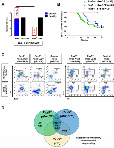 我們考慮了在SPF條件下腸道生理性微生物群的作用,以及在沒(méi)有自然感染誘因的情況下,通過(guò)細菌枯竭來(lái)改變它是否會(huì )導致白血病的發(fā)生。為了測試這一點(diǎn),另外一組出生在SPF的23只Pax5+/-小鼠沒(méi)有被轉移到CF,而是在整個(gè)實(shí)驗過(guò)程中一直保持在SPF中。這些小鼠接受抗生素治療。