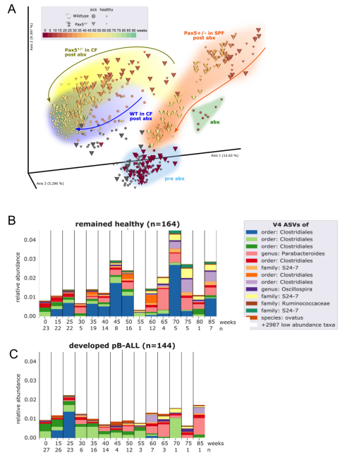 我們首先證實(shí),抗生素治療后的微生物群落以一種依賴(lài)于基因型的方式再生,并且能夠隨著(zhù)時(shí)間的推移而重建(圖5A)。接下來(lái),我們將Pax5+/-發(fā)展為PB-ALL的小鼠的腸道微生物群與在整個(gè)實(shí)驗過(guò)程中保持健康的小鼠的腸道微生物群進(jìn)行了比較。通過(guò)對所有時(shí)間點(diǎn)應用離散FDR,我們確定了3983個(gè)已鑒定的V4-ASV中的42個(gè)在白血病前期Pax5+/-小鼠(n=144,糞便樣本)和健康Pax5+/-小鼠(n=164,糞便樣本)之間差異豐富(圖5B,C)。這些發(fā)現將遺傳易感性和耗盡的微生物群與那些將患上感染驅動(dòng)的PB-ALL的Pax5+/-小鼠聯(lián)系在一起。綜上所述,這些發(fā)現表明腸道微生物群有可能被用作早期生物標記物來(lái)識別易患白血病的遺傳易感小鼠。