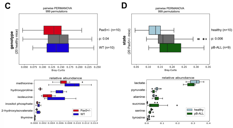 接下來(lái),我們調查了小鼠血清中的代謝體成分是否能幫助我們識別遺傳性PB-ALL的易感性。為了驗證這一點(diǎn),我們用GC-MS分析了SPF飼養的WT(n=10)和Pax5+/-(n=10白血病前期,n=10白血病)小鼠的代謝組(圖6A)。PCoA表示按基因型和健康狀況進(jìn)行聚類(lèi)(圖6B)。我們發(fā)現52種化合物中有6種在WT和白血病前期Pax5+/-小鼠之間差異顯著(zhù)(圖6C)。與白血病Pax5+/-小鼠血清樣本相比,健康的白血病前期Pax5+/-小鼠血清樣本中有16種化合物含量顯著(zhù)不同(圖6D顯示了前6種化合物)。
