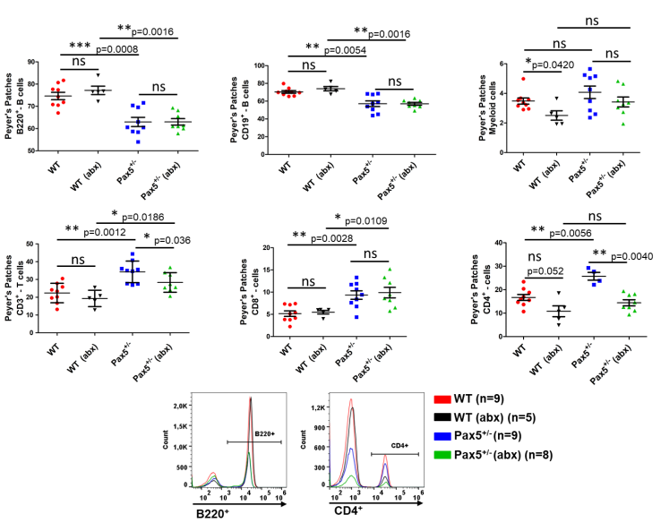 我們設立了第二個(gè)小鼠隊列,命名為“ABX”,并用抗生素治療這些小鼠以清除細菌。這個(gè)隊列由27只Pax5+/-和18只WT小鼠組成,我們在轉移時(shí)(在服用抗生素之前)、抗生素治療后4周和8周收集糞便顆粒,然后每?jì)芍苁占淮?,直到一只小鼠出現明顯的PB-ALL癥狀或達到其自然壽命的終點(diǎn)。通過(guò)微生物分析、糞便DNA濃度分析和16S rRNA擴增序列測定(圖S7),證實(shí)了抗生素雞尾酒的殺菌效果。在抗生素治療期間從小鼠身上收集的糞便樣本主要包含來(lái)自它們植物性飲食的Read(平均82%的Read可以歸類(lèi)為葉綠體或線(xiàn)粒體來(lái)源)。當我們分析抗生素治療對不同器官造血室的影響時(shí),我們觀(guān)察到抗生素治療并不改變WT或Pax5+/-小鼠的B細胞發(fā)育。然而,在抗生素治療后,我們觀(guān)察到Pax5+/-小鼠外周血中成熟B細胞的減少,但未觀(guān)察到WT小鼠中成熟B細胞的減少。