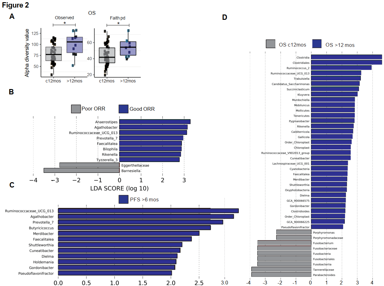 作者檢測的隊列中所有患者alpha多樣性在OS>12個(gè)月和OS<12個(gè)月的患者之間差異不顯著(zhù)。依據臨床數據比較了組間GM的組成。在PFS>6個(gè)月的患者中,Ruminococcaceae UCG 13 ?Agathobacter富集。在OS>12個(gè)月的患者中Lachnospiraceae UCG 001富集。