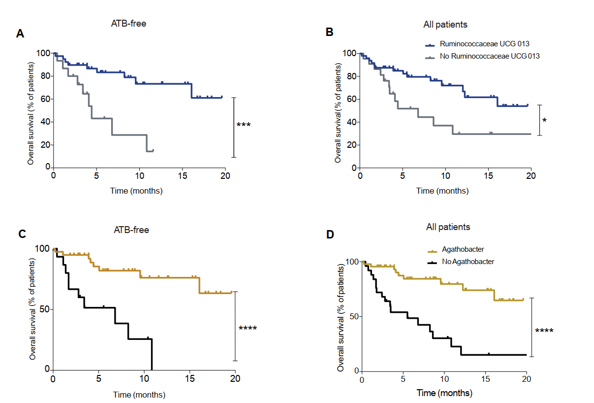 由于A(yíng)TB的使用顯著(zhù)改變了GM的組成,作者通過(guò)排除接受ATB治療的患者來(lái)描述GM組成。在無(wú)ATB組,alpha多樣性降低與較短的OS有關(guān)(圖2A)。在beta多樣性分析中沒(méi)有發(fā)現不同的clusters。Ruminococcaceae UCG 13Agathobacter在具有良好ORR和PFS>6個(gè)月的個(gè)體中富集(圖2B和2C)。Ruminococcaceae UCG 13在OS>12個(gè)月的患者中富集(圖2D)。在未接受ATB治療的患者中,Clostridiales order在OS>12個(gè)月的患者中富集(圖2D)。