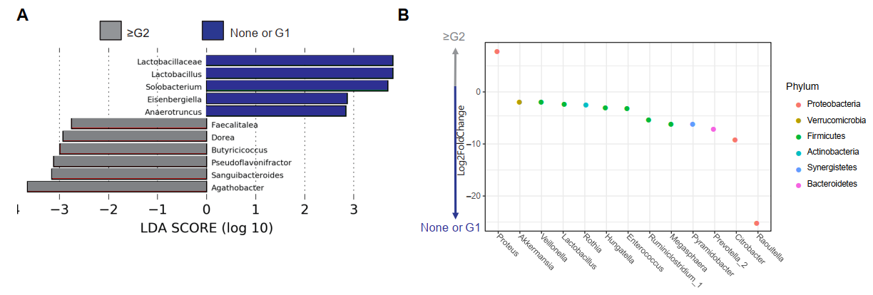 考慮到GM與irAE之間的可能存在聯(lián)系,作者分析了經(jīng)歷臨床相關(guān)irAE的患者(>2級)和不嚴重的irAE患者(1級或無(wú))之間的GM組成間的差異。在未接受ATB治療的患者和所有患者中,組間的細菌多樣性沒(méi)有差異。LEfSe分析中Lactobacillaceae和DESeq2分析中Raoultella?在未經(jīng)歷嚴重irAE患者糞便中富集(圖4A和4B)。盡管Akkermensia與改善的臨床結果無(wú)關(guān),但是其與較輕的irAE相關(guān)(圖4B)。