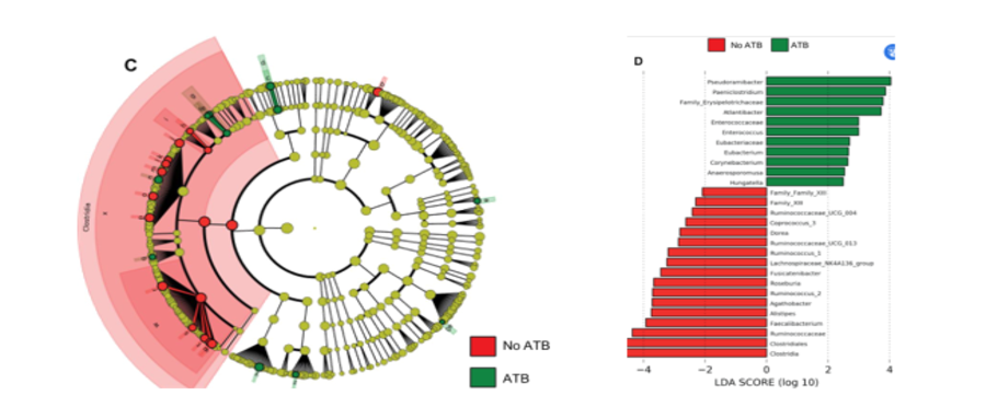 作者研究了ATB對GM組成的影響。ATB的使用與Shannon和Inverse Simpson指數減少有關(guān)(圖1A)。在分析ATB和無(wú)ATB組beta多樣性時(shí),聚類(lèi)到兩個(gè)clusters(圖1B)。未接受ATB治療的患者糞便中富集Clostridia,尤其是Ruminococcaceae UCG 13、Clostridiales?和?Agathobacter(圖1C)。而接受ATB治療的患者糞便中富集Hungatella(圖1D)。