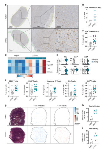 TGFβ-中和后CAF重塑,特別是具有潛在T細胞調節活性的CAF亞群的出現,促使我們確定TGFβ-阻斷對建立抗腫瘤免疫反應的影響。由于ilCAFs中T細胞趨化分子基因表達升高,CD8免疫組化染色顯示細胞毒性T細胞浸潤在治療組之間存在較大差異(圖6a)。流式細胞分析證實(shí)了TGFβ-阻斷作用下細胞毒性T細胞數量的增加(圖6c),支持TGFβ-阻礙可能導致免疫細胞反應的全面覺(jué)醒。在單細胞水平上也證實(shí)了這些發(fā)現。為了評估這種與浸潤T細胞組織分布相關(guān)的激活程度,我們隨后通過(guò)空間轉錄組分析生成了與T淋巴細胞存在及其活性相關(guān)基因的腫瘤路圖。