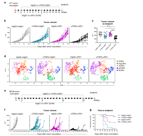 綜上所述,這些數據促使我們研究TGFβ-阻斷劑在體內對CAF表型和功能的相對影響。為此,6周齡雌性小鼠接種4T1腫瘤細胞,隨后用TGFβ阻斷抗體或同型對照處理,研究設計如圖2c所示。結果表明這種腫瘤進(jìn)展的延遲似乎不是由抗TGFβ對腫瘤細胞的直接作用引起的,更可能是TGFβ阻斷后微環(huán)境變化的結果。事實(shí)上,使用TGFβ中和抗體可導致整體基因表達的顯著(zhù)差異,這在對大量冷凍腫瘤RNAseq分析中得到證實(shí)(圖2f)。與這些發(fā)現一致的是,我們通過(guò)分析與膠原沉積和纖維化相關(guān)的基因特征,描述了抗tgfβ治療小鼠腫瘤中整體促纖維化程序的顯著(zhù)減少(圖2h)。綜上所述,這些數據表明靶向TGFβ影響了腫瘤微環(huán)境中的成纖維細胞動(dòng)力學(xué)。