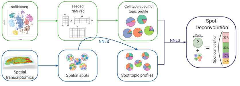 ?現在10x Visium數據基礎的分析思路是將每個(gè)spot看作一個(gè)細胞,然后參考單細胞轉錄組的分析思路進(jìn)行分析。但是現在的實(shí)驗中,單個(gè)spot中包含不僅是一個(gè)細胞。如何確定每個(gè)spot中包含的細胞,對于空間轉錄組的分析是有幫助的。SPOTlight可以結合單細胞RNA測序信息反卷積空間數據,識別每個(gè)spot中的細胞類(lèi)型和比例。