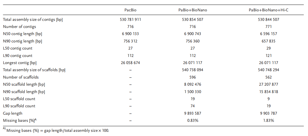 1. 材料:C.×hytivus自交第14代(S14);測序:~69X PacBio+~104X Hi-C+Bionano;轉錄組輔助基因預測:Illumina RNA-Seq 及 PacBio Iso-Seq