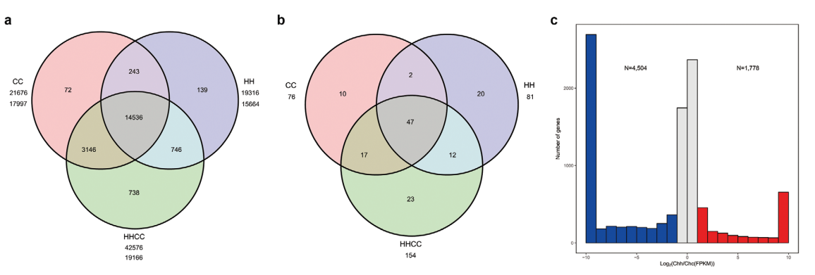 與已測序的栽培黃瓜基因組一樣,金瓜中大部分的TE為長(cháng)末端重復序列。Chytivus(S14)的Chc亞基因組(SubC)含有的TEs少于二倍體C.sativus(CC)基因組,而Chh亞基因組(SubH)保持了幾乎相同的不同類(lèi)型TEs的含量和比例。共預測了45687個(gè)基因,平均基因長(cháng)3846bp,每個(gè)基因有5.26個(gè)外顯子。BUSCO評估結果為90.90%,CEGMA評估結果為97.82%。在CC和HH二倍體基因組中鑒定的18882個(gè)同源基因家族中,在C.×hytivus(S14)異源四倍體中也鑒定了18428個(gè)(97.60%)(圖2)。