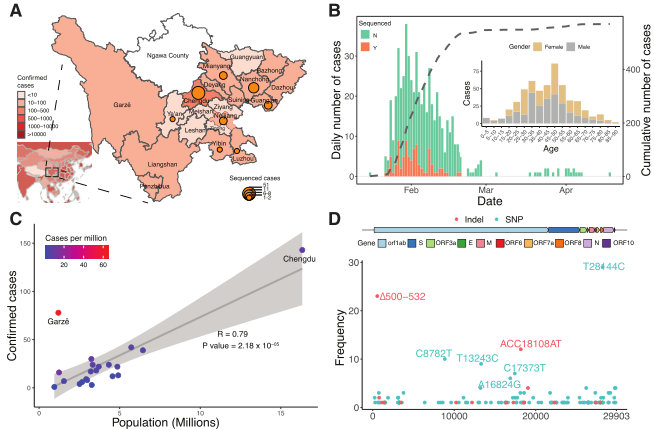 與20家醫院和研究機構合作,分析了在2020年1月22日至2月20日期間在中國四川省收集的流行病學(xué)、遺傳和臨床數據。2020年1-2月底,四川省經(jīng)qPCR檢測確診病例538例,其中成都病例占28.8%(圖1A)。四川確診病例呈指數增長(cháng),2020年1月30日達到高峰,每天新增確診病例38例(圖1B)。若人員更密集,發(fā)生病例的頻率更高(圖1C),表明社交距離可能是防止病毒傳播的一個(gè)關(guān)鍵因素。