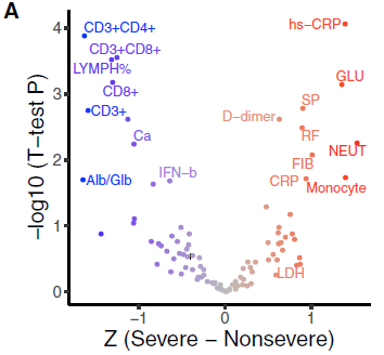 ?圖3A 與COVID-19嚴重程度相關(guān)的顯著(zhù)特征的火山圖