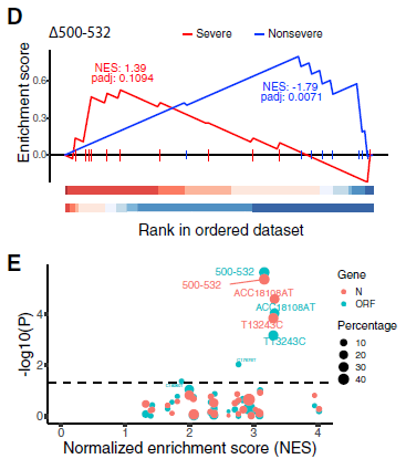 采用類(lèi)似GSEA的分析方法,來(lái)鑒定一個(gè)突變體是否富集嚴重/非嚴重的臨床表型。發(fā)現Δ500-532與ESR等嚴重相關(guān)表型呈負相關(guān)?;谟?沒(méi)有某種變異類(lèi)型,將病例分為兩組,發(fā)現感染Δ500 -532病毒的患者在所有檢測的35種變異中Ct值最高(圖3E)。