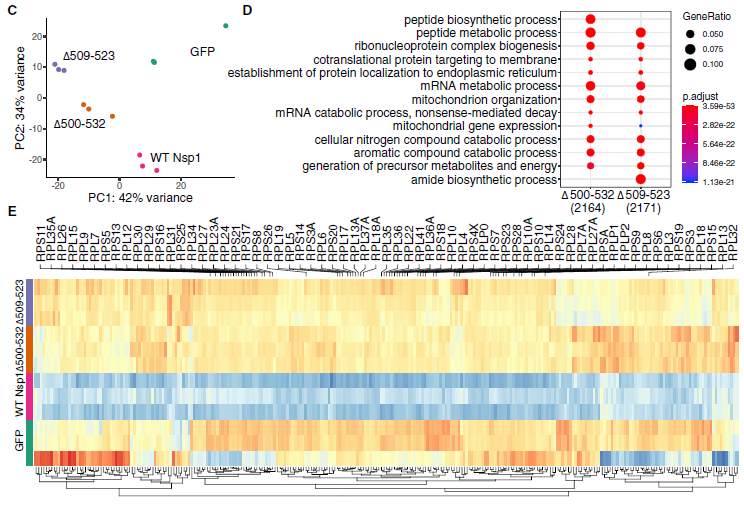 GO富集分析發(fā)現,與WT Nsp1相比,突變體Nsp1在生“肽的生物合成/代謝過(guò)程”,“核糖核蛋白復合生物發(fā)生”,“靶向膜/內質(zhì)網(wǎng)的蛋白質(zhì)”,“mRNA代謝過(guò)程”和“無(wú)意義介導的衰變”等方面顯著(zhù)上調,符合報道的SARS-CoV-2 Nsp1的功能(圖5D)。