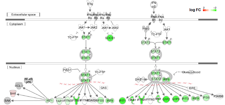 圖6G 與表達WT Nsp1的A549細胞相比,Δ500-532突變體中干擾素信號通路顯著(zhù)下調(綠色表示下調,紅色表示上調)