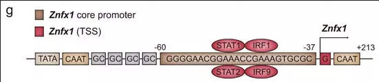 為了確定哪些核苷酸和區域Znfx1轉錄中很重要,使用promoter 2.0( http://www.cbs.dtu.dk/services/promoter/)、JASPAR(http://jaspar.genereg.net/)和CpGplot(http://www.ebi.ac.uk/Tools/seqstats/emboss_cpgplot/)進(jìn)行識別,其中包含TATA框、GC框和CAAT框的Znfx1的-1,064~+63之間的區域,是啟動(dòng)子。對轉錄因子結合位點(diǎn)的進(jìn)一步分析表明,Znfx1的啟動(dòng)子在相對集中和重疊的區域中包含STAT1、STAT2、IRF1和IRF9結合基序?;谶@些分析,構建了一個(gè)Znfx1啟動(dòng)子報告基因載體,包含?1,064~+63之間的區域,以及一個(gè)突變的報告基因構建體,其中缺失了STAT1、STAT2、IRF1和IRF9結合motif。接下來(lái),STAT1,STAT2,IRF1或IRF9過(guò)表達質(zhì)粒和2個(gè)報告基因載體轉染293T細胞,報告基因分析表明,在STAT1、STAT2、IRF1或IRF9存在的情況下,報告基因的表達可以由Znfx1啟動(dòng)子誘導,而不能由缺少轉錄因子結合位點(diǎn)的啟動(dòng)子載體誘導(圖1l)??偠灾?,ZNFX1是一個(gè)ISG,其病毒感染后的上調取決于JAK1-STAT1級聯(lián)反應。