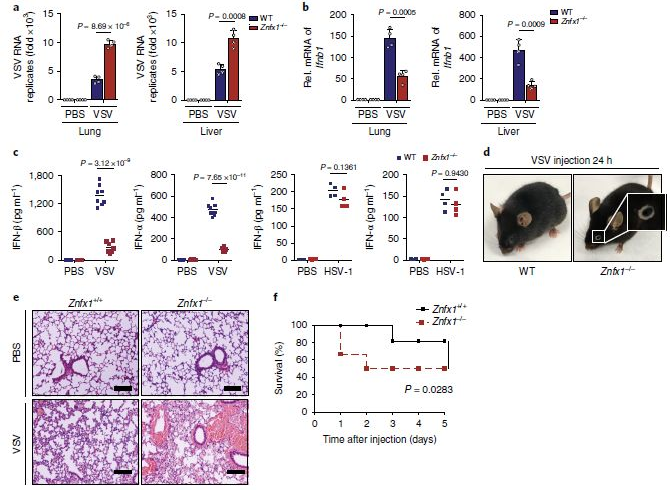 ZNFX1在宿主體內對抗病毒感染的防御中的重要性:通過(guò)尾靜脈向野生型和Znfx1-/-小鼠注射了VSV。與野生型小鼠相比,Znfx1-/-小鼠的肺和肝中的VSV復制增強了(圖3a),隨著(zhù)肺和肝中Ifnb1表達的減少,在Znfx1-/-小鼠中血清中IFN-α和IFN-β的分泌降低(圖3b,c)。而HSV-1感染后,Znfx1-/-和野生型小鼠之間血清中的IFN-α和IFN-β沒(méi)有差異(圖3c)。有趣的是,VSV感染一天后,Znfx1-/-小鼠中有80%患有結膜炎,這是VSV感染的早期癥狀(圖3d)。另外,觀(guān)察到VSV感染后炎性細胞更多地滲透到Znfx1-/-小鼠的肺中(圖3e),并且Znfx1-/-小鼠在存活試驗中對VSV感染的抵抗力較弱(圖3f)。這些數據表明,Znfx1缺乏后體內產(chǎn)生較少的I型IFN,削弱了針對RNA病毒感染的先天免疫反應??傊?,ZNFX1專(zhuān)門(mén)針對RNA病毒發(fā)揮其抗病毒特性。