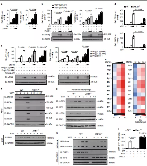 為了研究ZNFX1在IFN信號傳導中的作用,通過(guò)ZNFX1過(guò)表達質(zhì)粒和Ifnb1-reporter或IFN刺激的應答元件(ISRE)報告質(zhì)粒瞬時(shí)轉染A549細胞進(jìn)行螢光素酶報告基因分析,然后進(jìn)行或不進(jìn)行VSV感染。結果表明,ZNFX1的過(guò)表達輕微激活了Ifnb1啟動(dòng)子和ISRE報告基因(圖4a)。此外,ZNFX1以劑量依賴(lài)的方式顯著(zhù)增強了由VSV、2種類(lèi)型的poly(I:C)或poly(dA:dT)觸發(fā)的Ifnb1啟動(dòng)子激活(圖4b,c)。相反,敲除Znfx1可降低VSV誘導的293T細胞中Ifnb1報告基因和ISRE報告基因的激活(圖4d)。Ifnb1和ISGs的轉錄以劑量和時(shí)間依賴(lài)性的方式誘導(圖4e),當ZNFX1在A(yíng)549細胞中過(guò)表達時(shí)隨著(zhù)劑量和時(shí)間增強反之敲除ZNFX1則降低。而與野生型細胞相比,Znfx1-/-A549和MEF細胞中ISG蛋白表達量分別減少(圖4f)。VSV感染后Znfx1-/-巨噬細胞中TBK1和IRF3的磷酸化低于野生型巨噬細胞(圖4g)。在VSV感染的Znfx1-/-293T細胞中,IRF3的二聚化也低于野生型細胞(圖4h)。野生型A549細胞中觀(guān)察到了VSV的限制性復制,但在Ifnar1-/-A549細胞中未觀(guān)察到(圖4i)。所有這些數據表明,ZNFX1通過(guò)誘導I型IFN的產(chǎn)生而參與抗病毒免疫反應,其抗病毒特性也取決于IFN信號傳導。