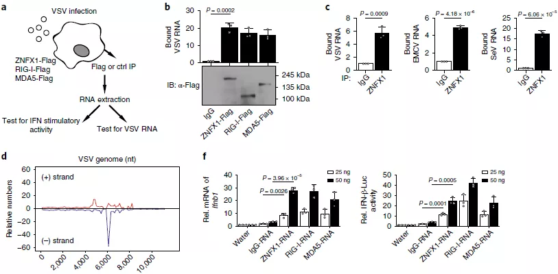 屬于RNA解旋酶SF2的許多基因被鑒定為結合病毒RNA的RNA病毒傳感器,因此假設屬于SF1的ZNFX1也可能作為RNA傳感器結合病毒RNA。為證實(shí)這一假設,首先在293T細胞中過(guò)表達ZNFX1,然后進(jìn)行pulldown和qRT-PCR分析以確定ZNFX1與VSV-RNA的高結合能力(圖5a,b)。也檢測了內源性ZNFX1與A549細胞中的VSV,EMCV和仙臺病毒(SeV)RNA的結合能力(圖5c)。通過(guò)用抗內源性ZNFX1的抗體從免疫沉淀物中分離RNA來(lái)進(jìn)行RNA免疫沉淀(RIP)測序分析,將ZNFX1相關(guān)的RNA比對到VSV基因組(圖5d),優(yōu)先定位于約6,000-8,000 nt的VSV片段(圖5e)。值得注意的是,當與ZNFX1相關(guān)的RNA轉染到A549細胞中時(shí),通過(guò)qRT-PCR和熒光素酶活性分析觀(guān)察到了Ifnb1的誘導轉錄和基于Ifnb1啟動(dòng)子的報告基因的誘導表達(圖5f)。