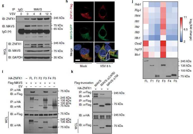 為了進(jìn)一步表征ZNFX1在感測病毒RNA時(shí)如何轉導抗病毒信號,檢查了ZNFX1與涉及IFN產(chǎn)生的配體(包括TRIF、MyD88,MAVS和STING)的相互作用。免疫共沉淀實(shí)驗表明,帶有HA標記的ZNFX1與帶有Flag標記的MAVS相關(guān),但與TRIF、MyD88和STING無(wú)關(guān)(圖6d)。免疫沉淀(Co-IP)實(shí)驗進(jìn)一步表明,ZNFX1和MAVS在A(yíng)549細胞中形成天然復合物,并且病毒感染后ZNFX1表達上調而增強了它們的結合(圖6e-g)。共聚焦顯微鏡實(shí)驗還表明ZNFX1與MAVS共定位(圖6h)。使用一系列ZNFX1截短突變體進(jìn)行進(jìn)一步的免疫沉淀試驗表明,全長(cháng)ZNFX1和含ARM的突變體,包括F3和F5,都可以與MAVS相互作用(圖6i)。與共免疫沉淀試驗一致,ZNFX1的全長(cháng)和F3截短突變體過(guò)表達導致了Ifnb1和ISG的誘導表達以及受限制的VSV復制(圖6j)。此外,如果沒(méi)有跨膜(TM)域,ZNFX1不能與截短的MAVS相互作用(圖6k),ZNFX1的線(xiàn)粒體分布與其與MAVS的相互作用無(wú)關(guān)。