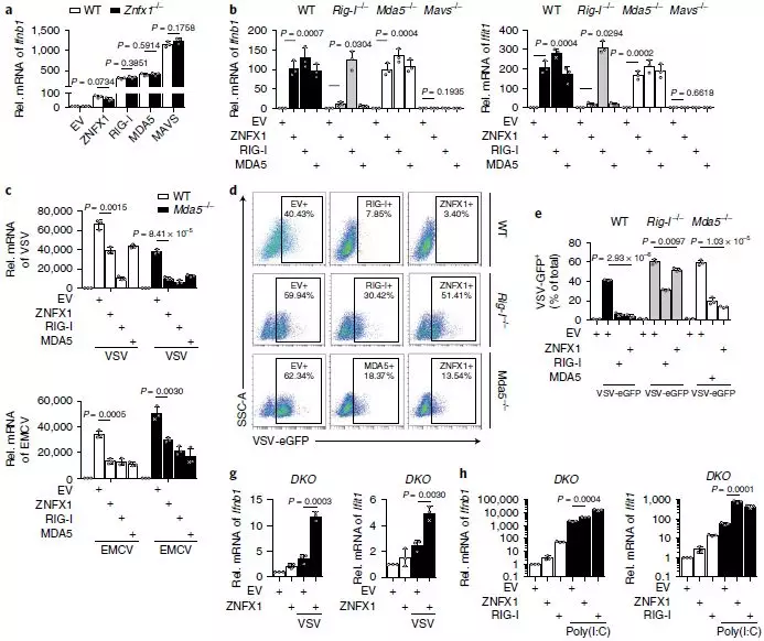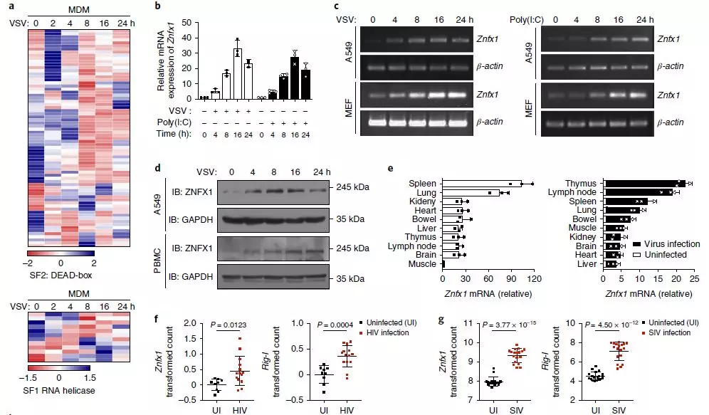 為了更深入地了解ZNFX1在抗病毒應答中的作用,進(jìn)行了qRT-PCR或免疫印跡分析,以了解VSV感染或干擾素誘導劑聚肌胞苷酸(poly(I:C))刺激A549細胞、外周血單個(gè)核細胞(PBMC)或小鼠胚胎成纖維細胞(MEF)細胞后ZNFX1的表達上調(圖1b–d)。qRT-PCR也證實(shí)了靜脈注射VSV后小鼠脾臟和肺中Znfx1的豐度上調(包括胸腺、淋巴結脾臟和肺)(圖1e)。作者還對先前收集的芯片數據集(GDS4231/4214/1271/3210/6082/6063)進(jìn)行了統計分析,發(fā)現與健康對照相比,在HIV感染患者和猿猴免疫缺陷病毒(SIV)引起的腦炎猴子中,Znfx1的RNA水平明顯更高(圖1f,g)。此外,在不同的細胞類(lèi)型(包括巨噬細胞、樹(shù)突狀細胞和上皮細胞)中感染病毒后,Znfx1的轉錄顯著(zhù)增加。這些數據都表明ZNFX1可能是抗病毒分子。
